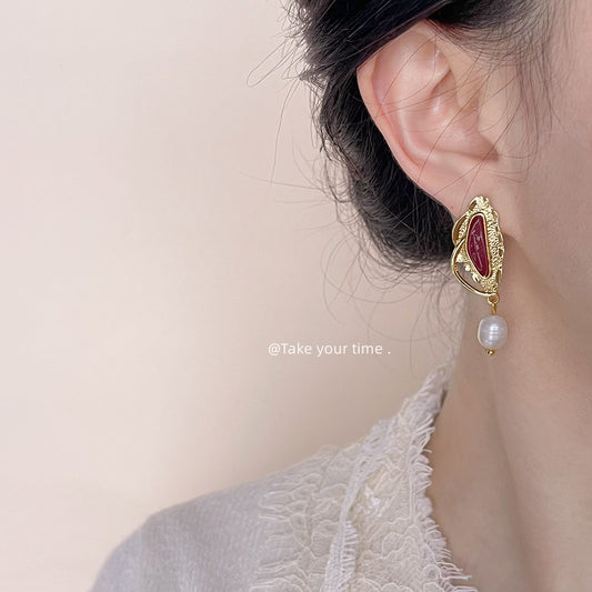 C廠【4922】法式復古淡水珍珠鍍14K酒紅色滴油異形不規則耳環飾品女 24.09-4