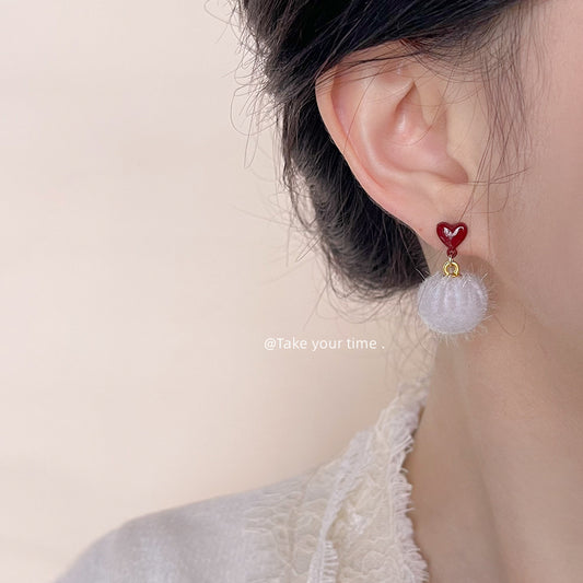 C廠【4900】冬天款毛球球日常通勤百搭烤漆酒紅色新款耳環女飾品 24.12-1