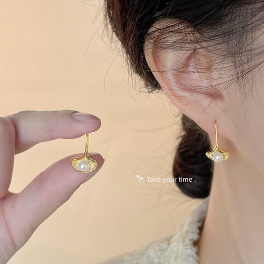 C廠【5029】時尚通勤氣質優雅銀杏葉耳飾 簡約秋冬新款鍍14K珍珠耳環批發 24.10-4