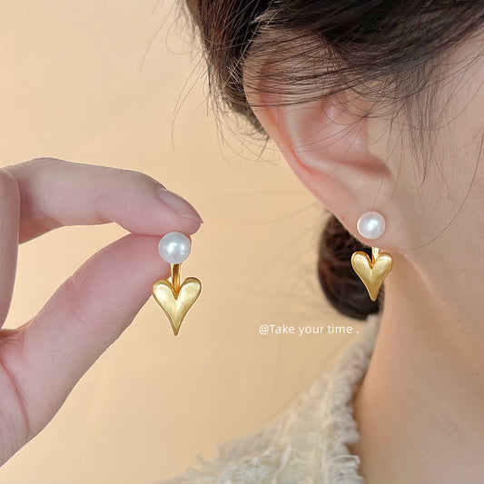C廠【5038】淡水珍珠一款兩戴925銀針鍍14K拉絲質感心形耳飾新款愛心耳環 24.10-4