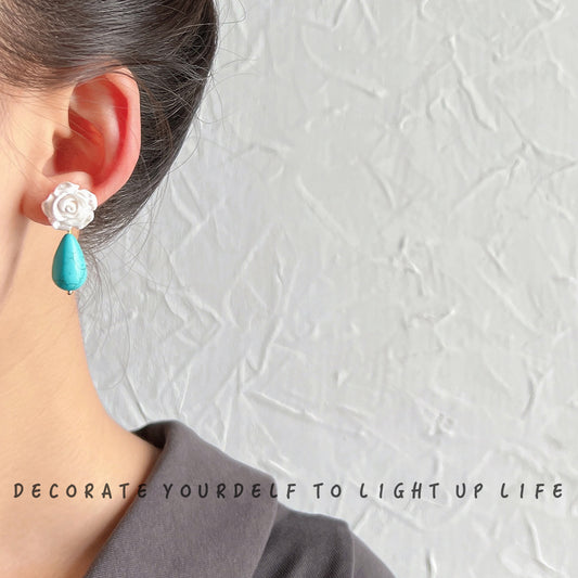 C廠【503】文藝復古水滴形合成綠松石流蘇耳環民族風玫瑰花耳環耳飾品度假風 25.05-4