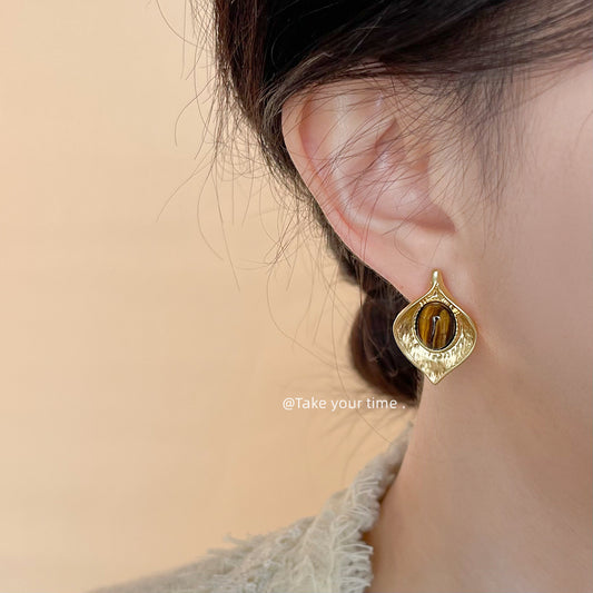 C廠【5031】美拉德風虎眼石樹葉小眾設計師耳環女文藝復古時尚高級感耳飾 24.10-4