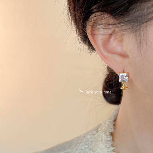 C廠【5040】實物很閃! 925銀針鍍14K方形幾何鋯石星星耳環高級感優雅耳環 24.10-4