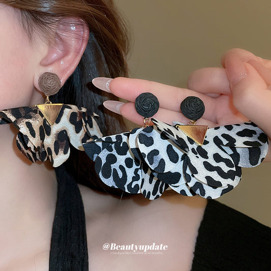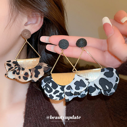 A廠【HE22581】三角形布藝豹紋花朵耳環女歐美風個性氣質耳環小眾誇張設計感耳飾 24.10-2