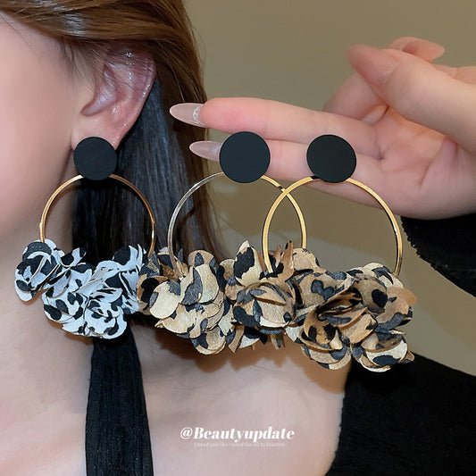 A廠【HE22577】鈦鋼不銹鋼布藝豹紋花朵耳環歐美風誇張耳環個性時尚設計感耳飾女 24.09-4