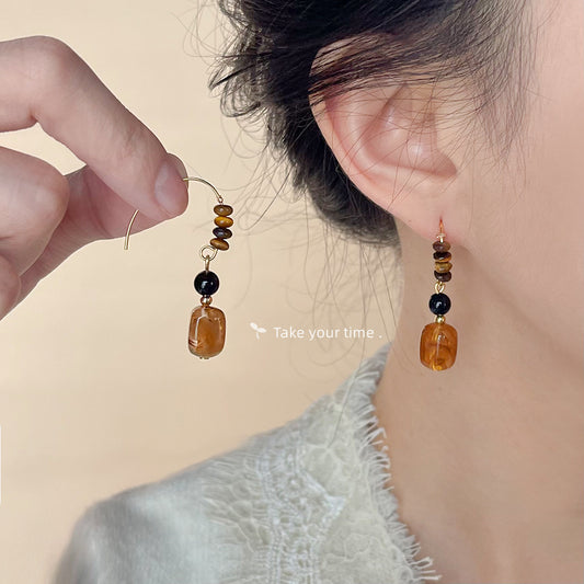 C廠【5085】文藝復古新中式設計師款虎眼石琥珀色手工耳環天然石耳環飾品 24.11-2