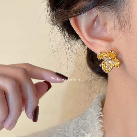 C廠【5104】梅花香自苦寒來~文藝復古電鍍14K銀針花朵耳環女鑲嵌鋯石耳飾 24.11-2