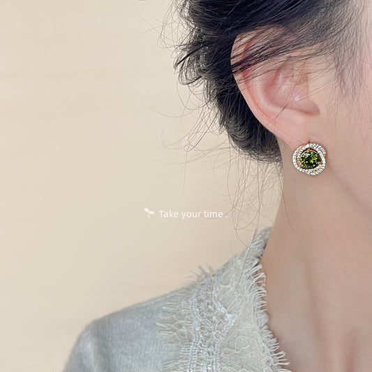 C廠【5077】微鑲鋯石925銀針鍍14K文藝復古橄欖綠幾何圓形新款耳環耳飾女 24.11-2
