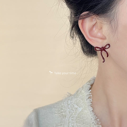C廠【5074】安可拉紅烤漆質感酒紅色秋冬爆款蝴蝶結耳環女時尚通勤高級感耳飾 24.11-2