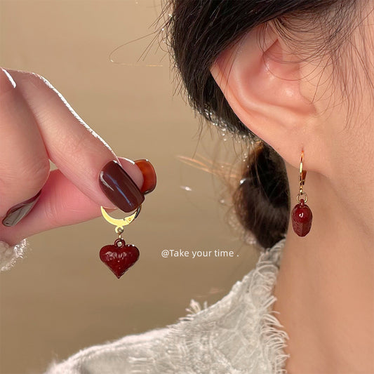 C廠【5148】酒紅色烤漆質感愛心耳飾女文藝復古港風簡約高級感心形耳環女 24.11-3