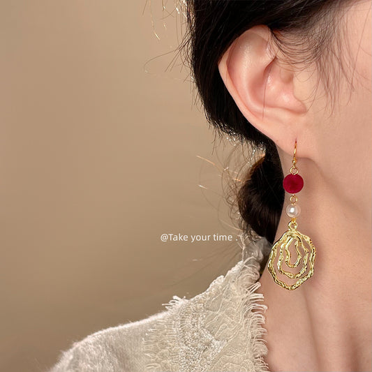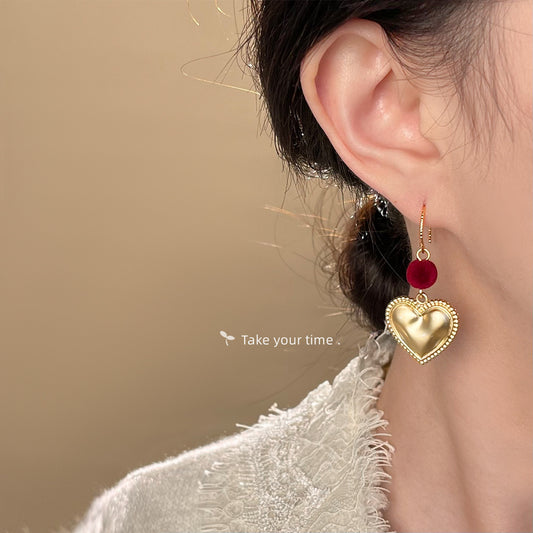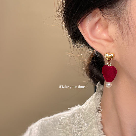 C廠【5135】霧面質感心形復古港風耳環女酒紅植絨手工藝設計感新款耳環飾品 24.11-3