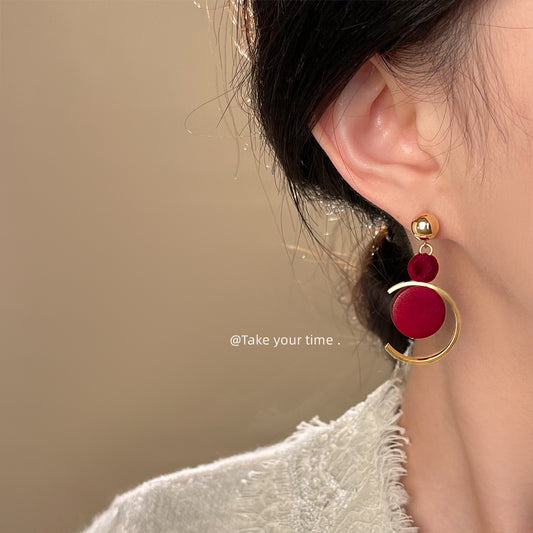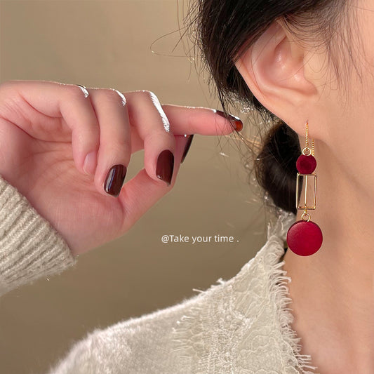 C廠【5140】原創設計木質幾何烤漆植絨酒紅色氣質簡約個性小眾設計師耳環耳環 24.11-3