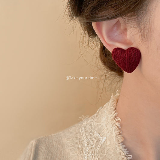 C廠【5131】文藝復古毛線質感酒紅色氣質港風心形愛心耳環女新款秋冬耳飾 24.11-2