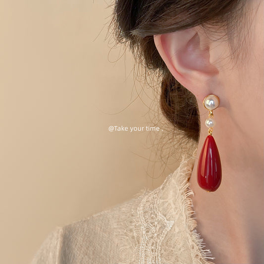 C廠【5129】文藝復古酒紅色氣質幾何高級感鍍14K琺瑯滴油耳環女 簡約百搭耳飾 24.11-2