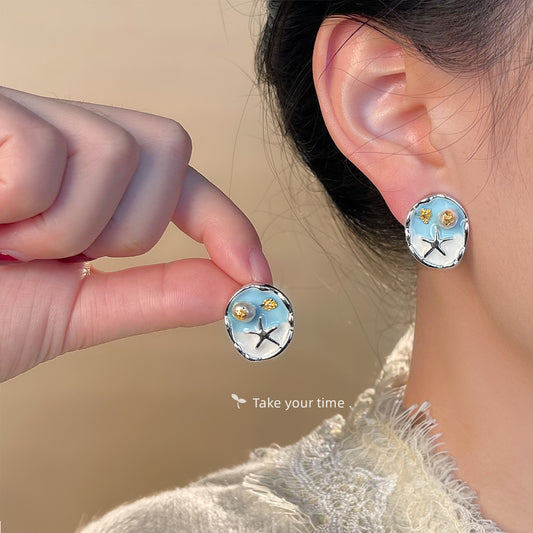 C廠【5258】淡水珍珠925銀針琺瑯滴釉海星海邊度假清新甜美耳飾耳釘 25.01-1