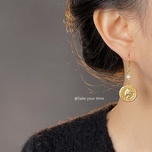 C廠【5273】法式復古淡水珍珠圓形金幣形狀耳環設計師款耳環飾品貨源 24.12-2
