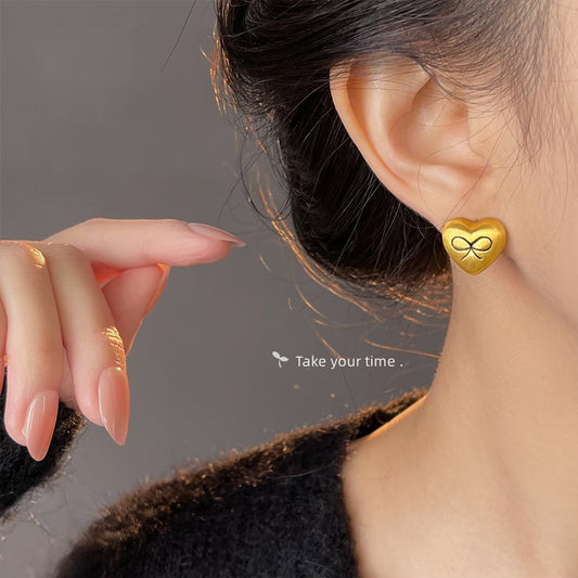 C廠【5276】拉絲質感925銀針鍍14K霧面心形蝴蝶結耳飾時尚復古高級感耳環耳環 24.12-2