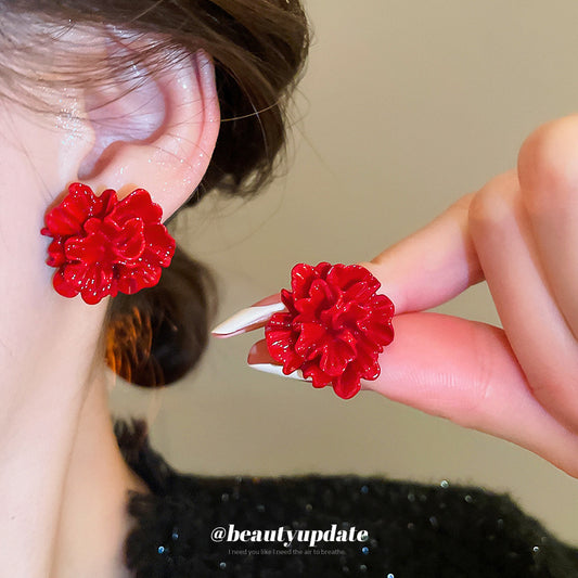 A廠【HE22775】925銀針紅色褶皺花朵耳環高級感時尚新款耳環港風復古簡約氣質耳環女 24.10-2