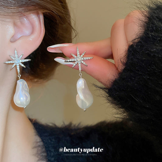 A廠【HE22773】925銀針不規則珠光珍珠款耳環高級感鋯石耳飾輕奢氣質芒星設計耳環女 24.10-2