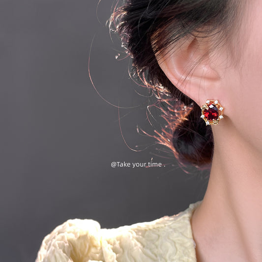 C廠【5819】復古高級感酒紅色鋯石925銀針鍍14K橢圓立體蝴蝶耳環耳飾 25.05-1
