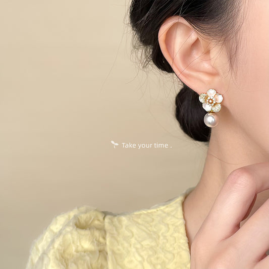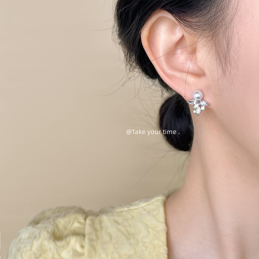 C廠【5920】微鑲鋯石925銀針冰花造型設計師款百搭高級感珍珠耳環耳環女 25.05-1