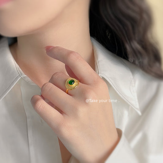 C廠【5878】厚鍍真金開口可調整法式復古祖母綠圓形幾何高級感戒指新款手飾女 25.05-1