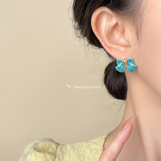 C廠【5922】清新甜美海藍色蝴蝶結手工琺瑯滴釉耳環氣質優雅夏日新款耳飾 25.05-1