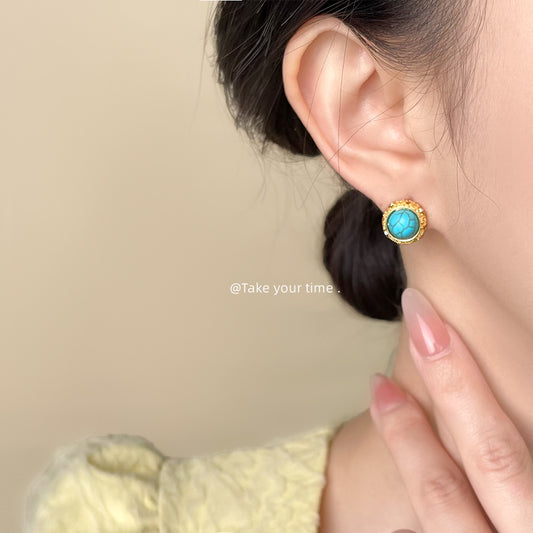 C廠【5927】文藝復古法式簡約925銀針鍍14K合成綠松石圓形幾何耳飾耳環女 25.05-1