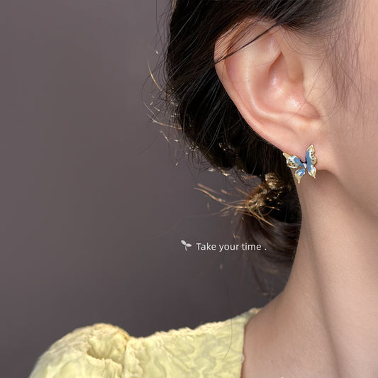 C廠【6167】【蝶群】幻彩蝴蝶琺瑯滴釉手工彩繪925銀針鍍14K新款耳飾耳環 25.06-1