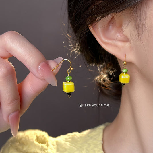 C廠【6181】國潮新中式黃色陶瓷幾何方形手工耳環女氣質個性新款耳環飾品 25.06-1