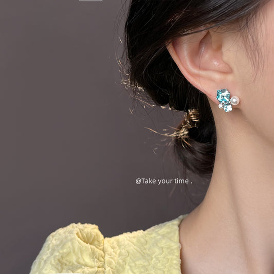C廠【6179】正品K9海藍寶色玻璃水晶方糖幾何立體小耳環清新甜美通勤新款耳飾 25.06-1
