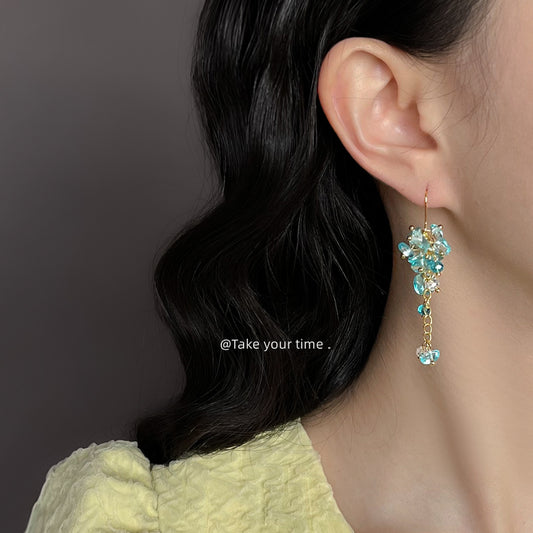 C廠【6305】長款誇張海藍寶色流蘇氣質清新甜美手工耳環女優雅度假風耳飾 25.07-1