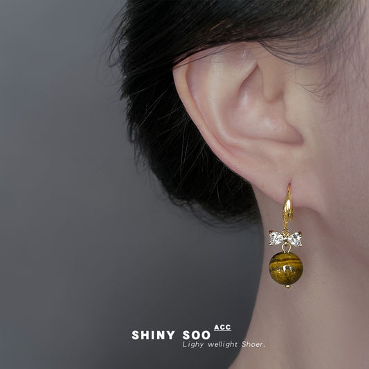 C廠【6784】高級感天然石虎眼石美拉德風時尚通勤蝴蝶結鋯石耳環氣質耳飾 25.09-3