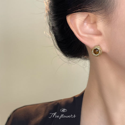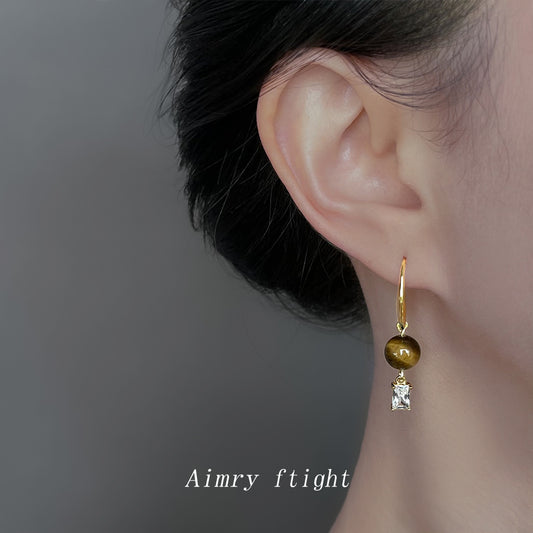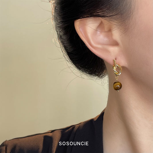C廠【6804】美拉德風時尚高級感天然石虎眼石幾何新款耳環文藝復古耳環女 25.09-3