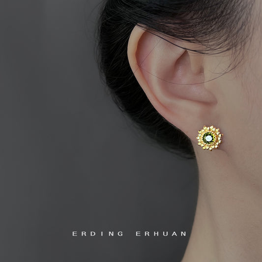 C廠【6878】【正能量】橄欖綠鋯石雛菊太陽花925銀針小耳環 時尚高級感耳飾女 25.10-1