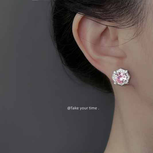 C廠【6877】小香風高級感925銀針微鑲粉鋯石幾何氣質優雅通勤新款耳飾女 耳環 25.10-1