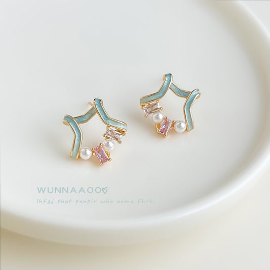 C廠【6871】原創清新甜美925銀針微鑲鋯石彩繪五角星奶油甜妹耳飾耳環女 25.10-2