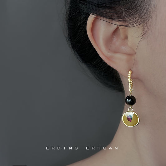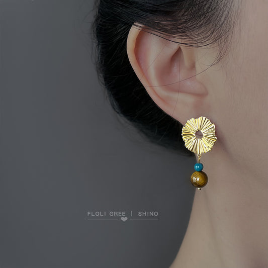C廠【6872】油畫風文藝復古天然石虎眼石琺瑯滴釉彩繪幾何長耳飾秋冬耳環女 25.10-1