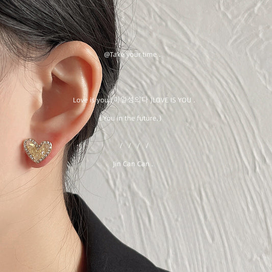 C廠【968】日落橘子海~森系超仙鑲鑽玻璃水晶心型耳環高級感氣質碎鑽耳飾女 24.01-2