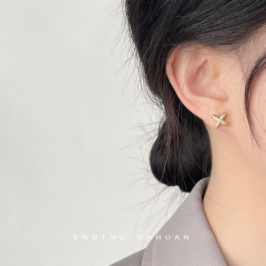 C廠【783】通勤百搭迷你版微鑲鋯石立體幾何雙層耳環925銀針鍍14K十字耳飾女 24.04-3