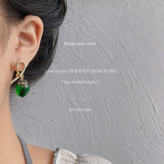 C廠【759】法式優雅赫本風祖母綠愛心手作耳環925銀針設計感鏤空繩結耳飾女 24.06-1