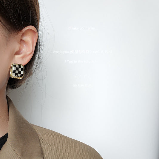 C廠【A301】時尚通勤黑白棋盤格方形耳環925銀針高級感輕奢時髦幾何氣質耳飾 24.06-4