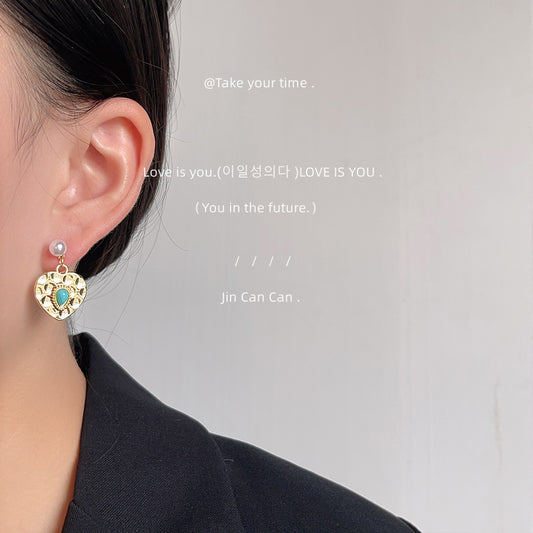 C廠【A735】中古風高級感合成綠松石原創耳環復古宮廷風金屬感愛心氣質耳飾女 24.07-2