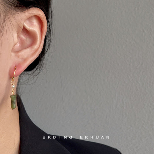 C廠【A731】新中式不對稱竹節手工藝串珠耳扣森系綠色天然石高級感溫婉氣質耳飾 24.06-4