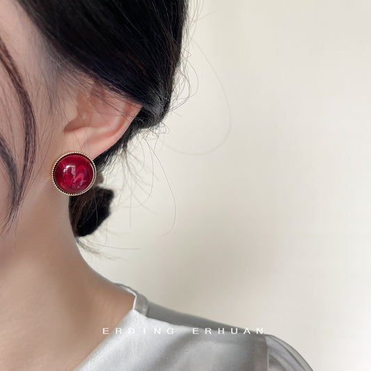 C廠【A331】法式宮廷風酒紅色暈染樹脂球耳環925銀針復古港風顯白圓耳飾女 24.05-2