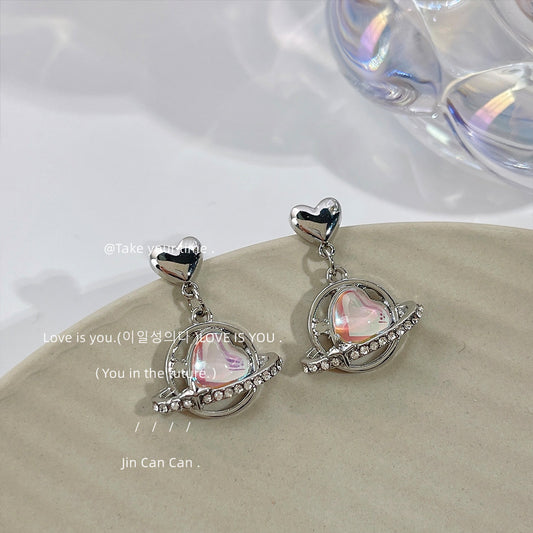 C廠【A195】甜酷風彩光玻璃鐳射水晶愛心耳環設計感小眾未來感星球創意耳環女 24.06-3
