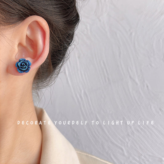 C廠【B251】磨砂質感藍色妖姬玫瑰耳環銀針法式復古浪漫簡約花朵細閃氣質耳飾 24.08-3