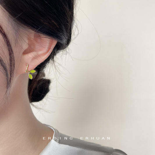 C廠【B944】春夏清新綠色迷你樹葉滴釉耳環小眾設計感簡約樹枝小巧氣質耳飾女 24.05-3