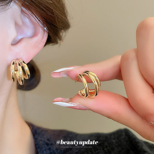 A廠【HE23178】真金電鍍925銀針多層金屬C型耳環女冷淡風個性耳環時尚氣質耳飾 24.10-4