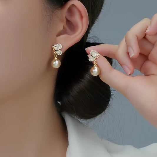 A廠【HE23198】925銀針鑲鑽蝴蝶香檳色珍珠款耳環女法式耳環時尚氣質耳飾輕奢高級感 24.10-4